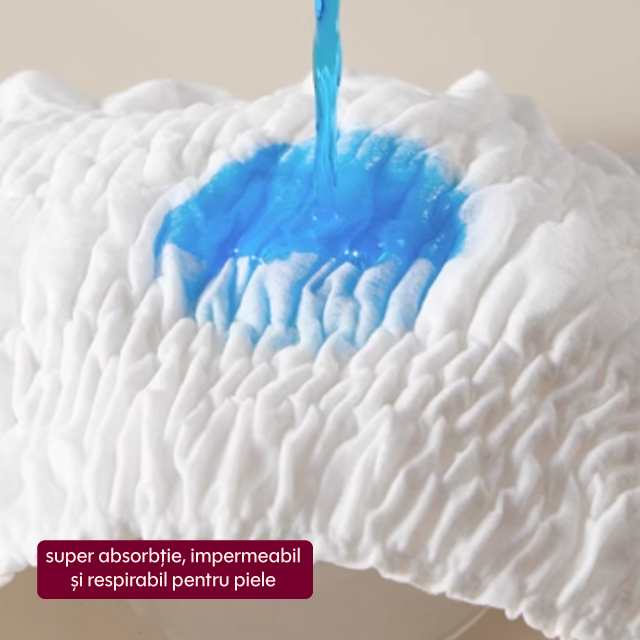 Protecția este oferită de o bandă din material absorbant (Fluff pulp SUA, SAP – Japonia) plasată strategic în zona sânilor, care previne scurgerile și menține bustul uscat.